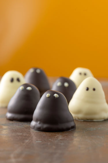 (U)hyggelige mini flødeboller i forklædning som søde spøgelser. Flødebollerne fåes i to varianter: mørkchokolade og vaniljeskum og hvid chokolade og lakridsskum - mums!