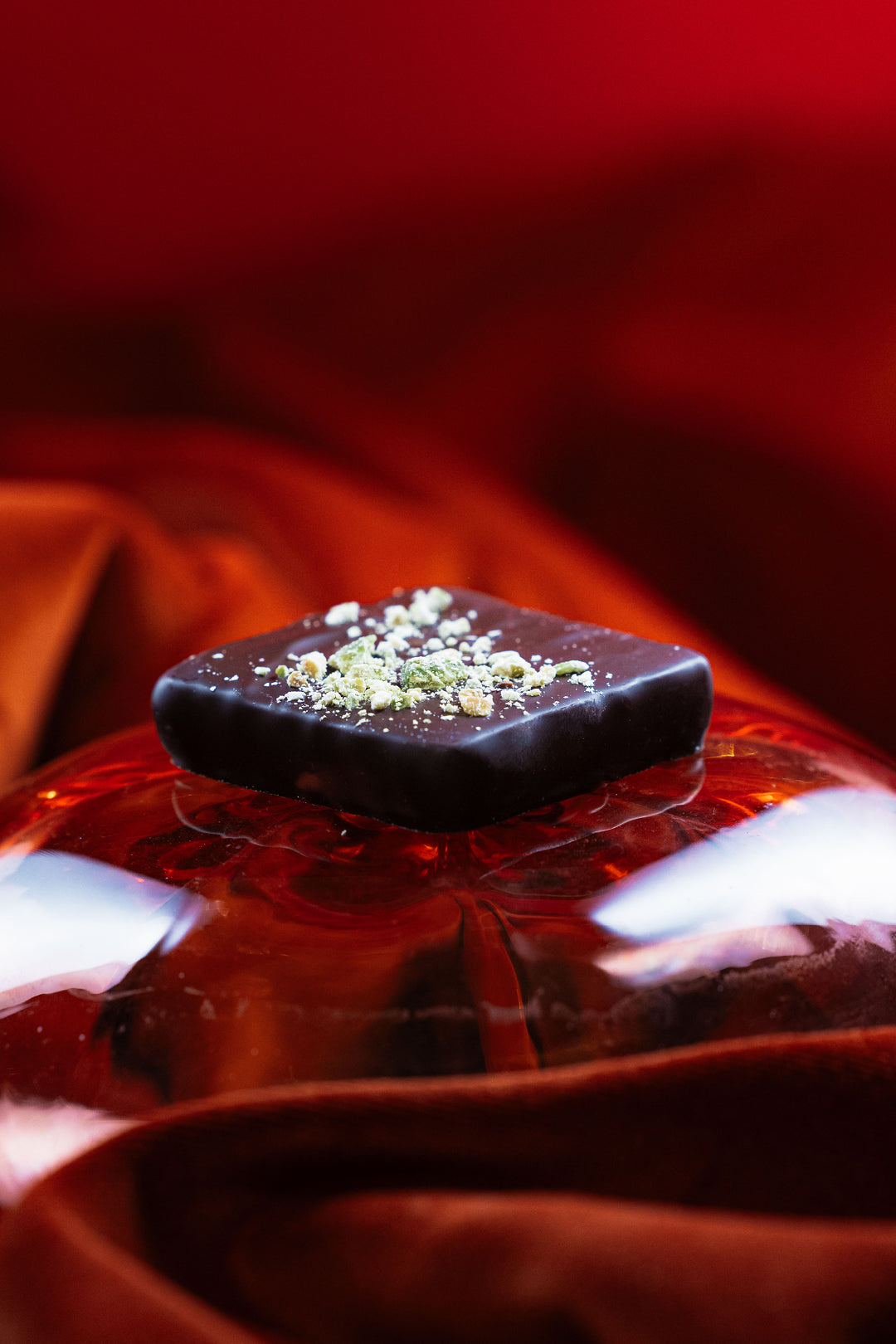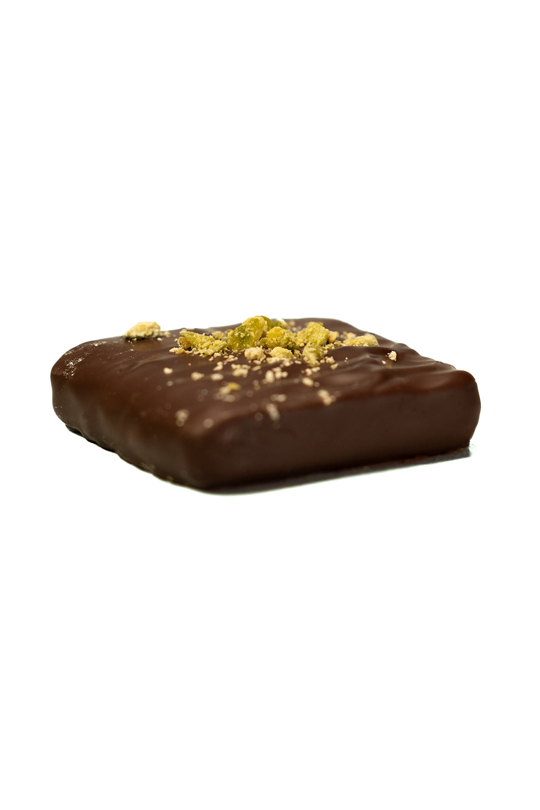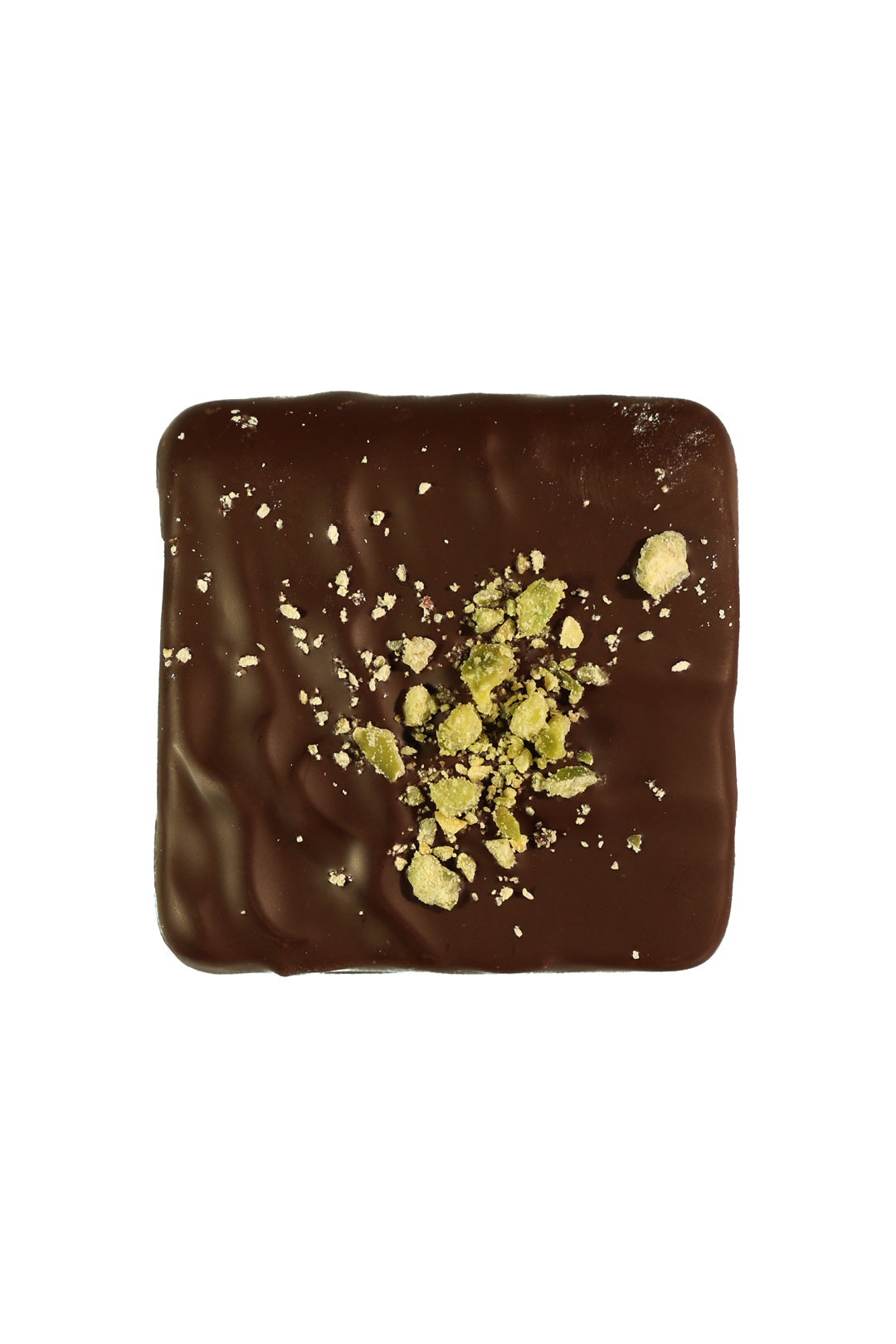 Pistaciemarcipan – Fyldig marcipan raffineret med ægte pistacie. Stykket er overtrukket med mørkchokolade og afpyntet med pistaciestøv.